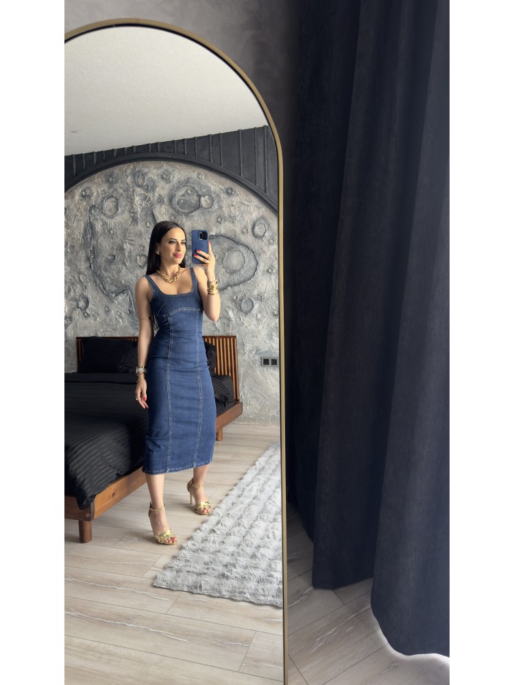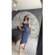 Pervin Çelik Kadın Premium Kalite Mavi Askılı Yırtmaç Detaylı Likralı Jean Elbise